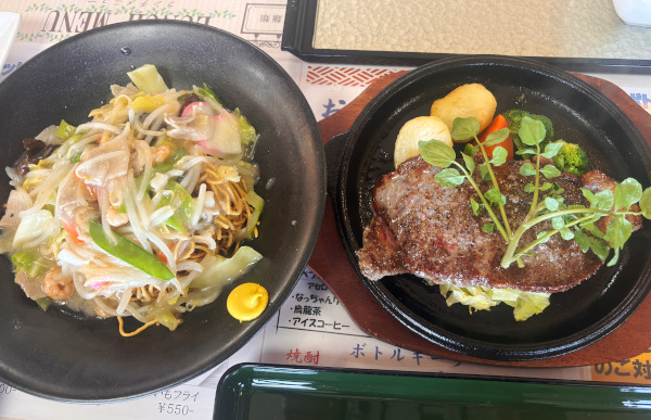 相方の皿うどんと、S尾さんの牛サーロインステーキ。