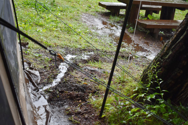 良く見ると、寝室テントの下に水が大量に流れていたようだ。